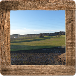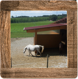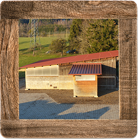 Offenstall mit großzügigem Paddock. Die eine Seite des Stalls hat eine Schiebetüre um eine gute Lüftung des Stalls zu gewähren!